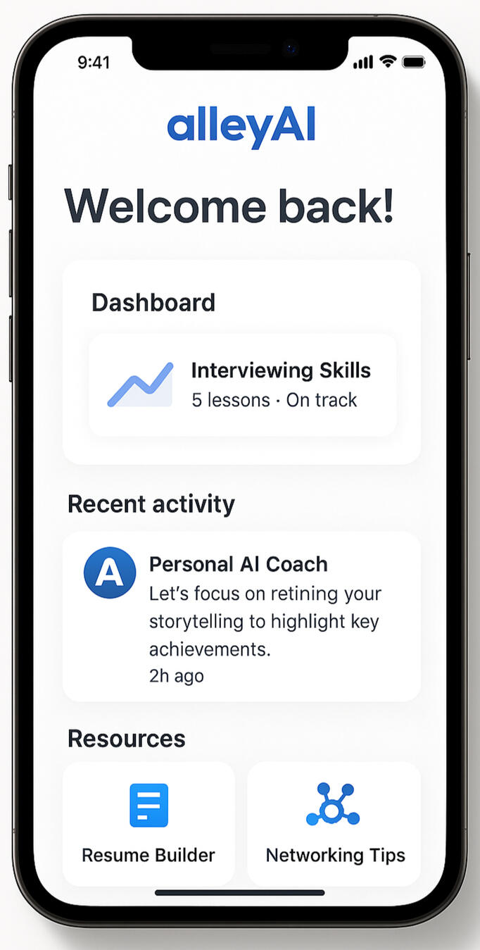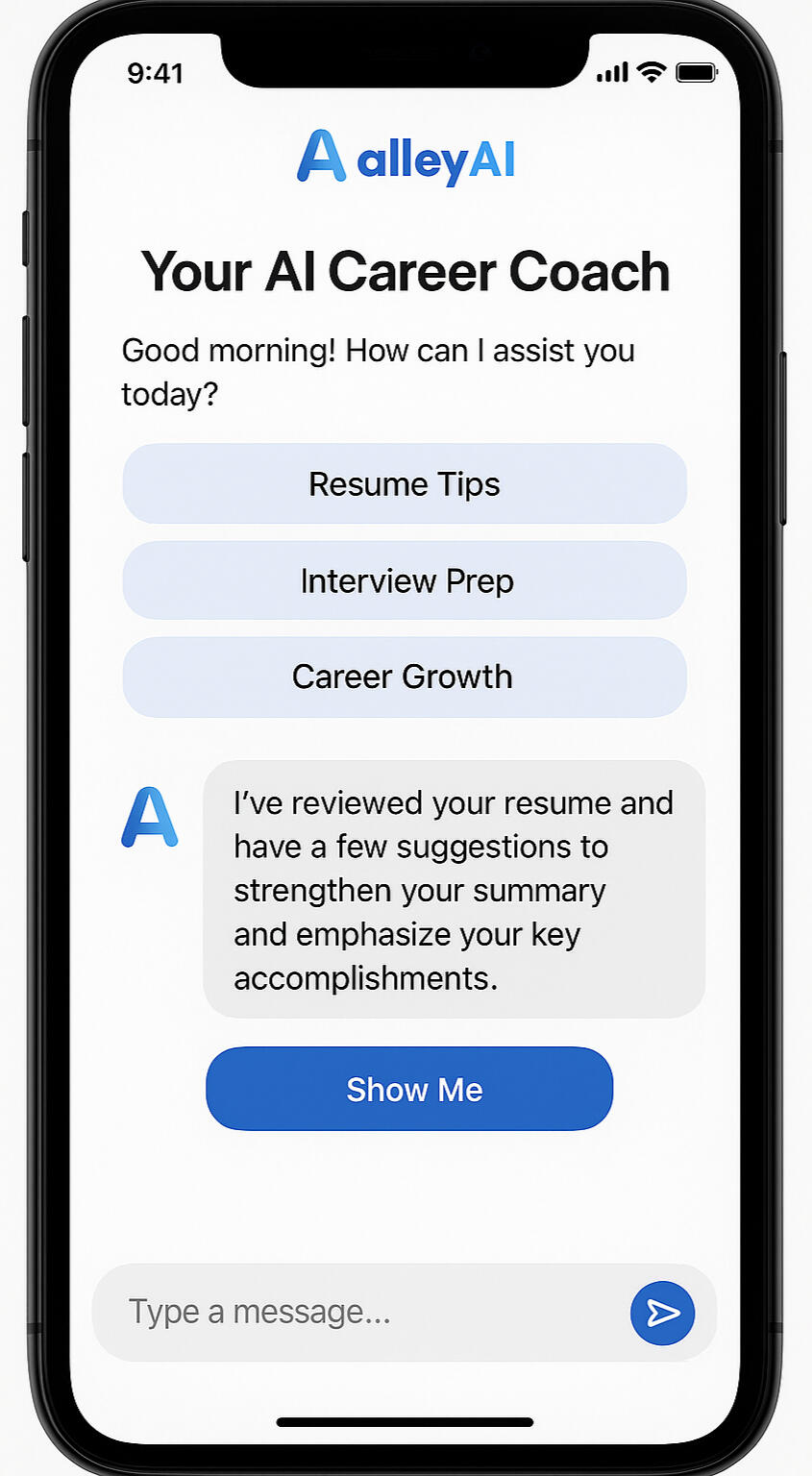 AlleyAI is here to elevate your career game to new heights.Alley doesn't just offer advice; it anticipates your needs and delivers personalized strategies to help you slam dunk your career goals. Whether you're a seasoned professional looking to make a career pivot or a recent graduate aiming to break into your desired field, AlleyAI is your trusted teammate every step of the way.